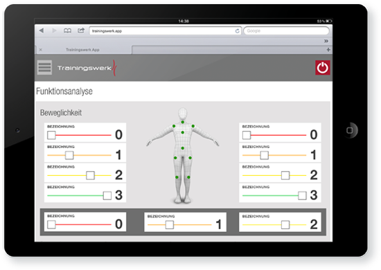 Die Funktionsanalyse ist ein elementarer Bestandteil des Körperwerk-Konzepts und hat deshalb auch ihren festen Platz in Trainingswerk. Mit einer detailierten Funktionsanalyse werden Stabilität und Flexibilität, Koordination, Kraft und Ausdauer ermittelt. Diese Werte im Verhältnis zu den persönlichen Zielen Ihrer Kunden sind die Basis für ein individuelles Trainingsprogramm, das es so nur ein einziges Mal gibt.
