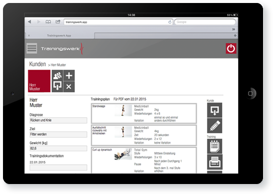 Mit Trainingwerk können Sie in Zukunft alle relevanten Daten Ihrer Kunden erfassen und übersichtlich anzeigen lassen. Durch die Dokumentation des Trainings behalten Sie stets den Überblick über den Heilungsverlauf und Trainingserfolge.